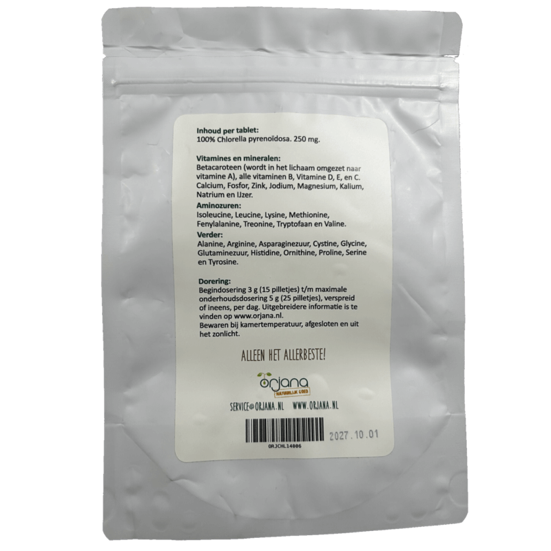 Van hoge kwaliteit Pyrenoidosa chlorella met een hoge ontgiftingscapaciteit en Chlorella Growth Factor (CGF) in pilletjes van 250mg. Dit is een iets groter pilletje dan voorheen maar nog steeds klein genoeg ook voor mensen die pillen slikken lastig vinden.
