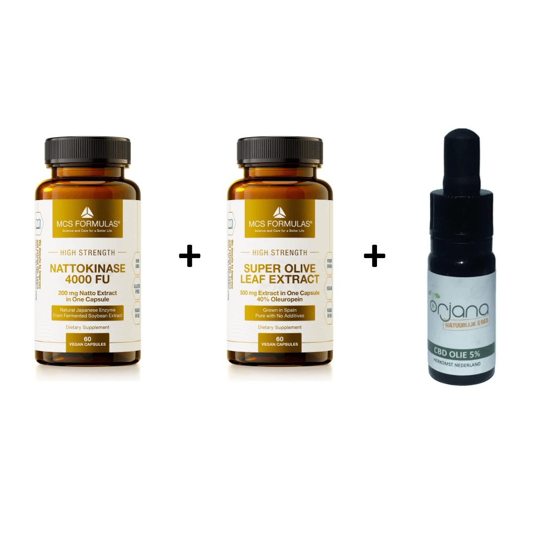 Profiteer vandaag nog van deze speciale aanbieding! Deze voordeelpak bestaat uit Nattokinase (200mg, 60 vcaps), olijfbladextract (500mg, 60 vcaps) en CBD-olie 5% (10ml) voor een gereduceerde prijs.
