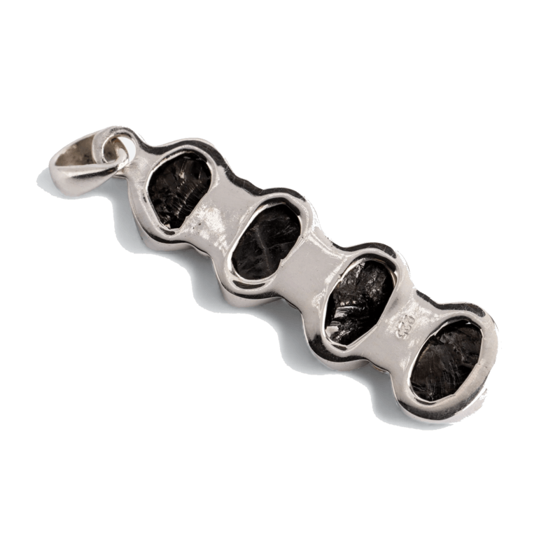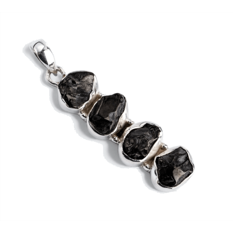 Een zilveren hanger met vier ruwe shungietstenen in een slanke zetting, gekozen voor iedereen die behoefte heeft aan minder ruis en meer innerlijke stevigheid.